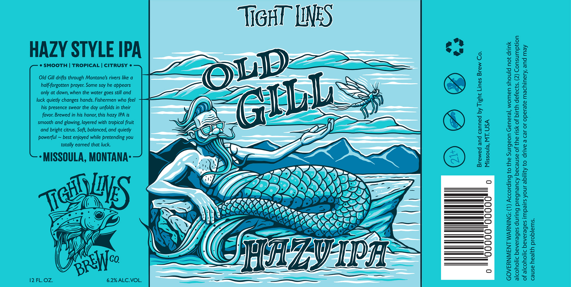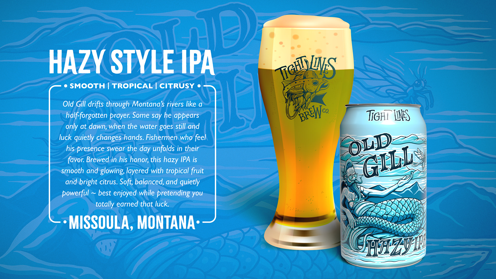 Old Gill is a Hazy IPA created for Tight Lines Brew Co., a Missoula, Montana–based brewery rooted in outdoor culture. The label features Old Gill—a mysterious half-man, half-trout who drifts through Montana’s rivers, quietly bringing good luck to anglers. The illustration blends humor and mystery while reflecting the brewery’s love of the outdoors.