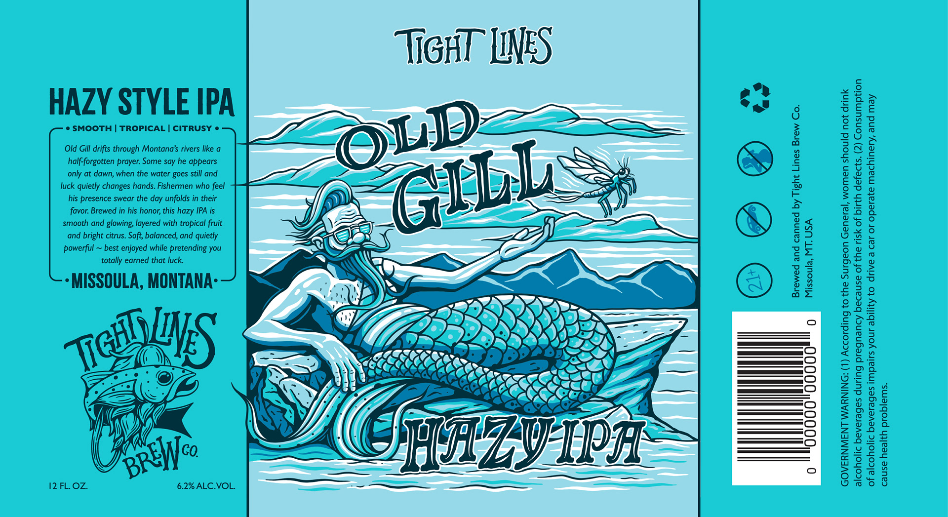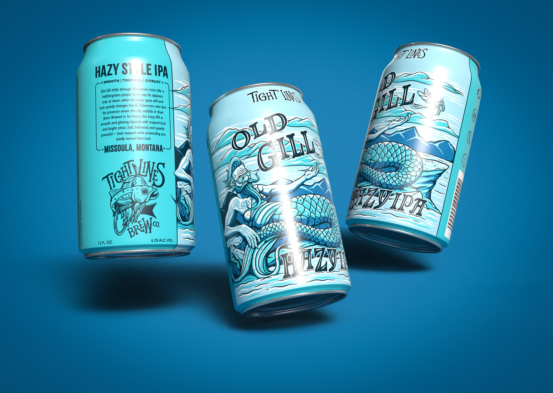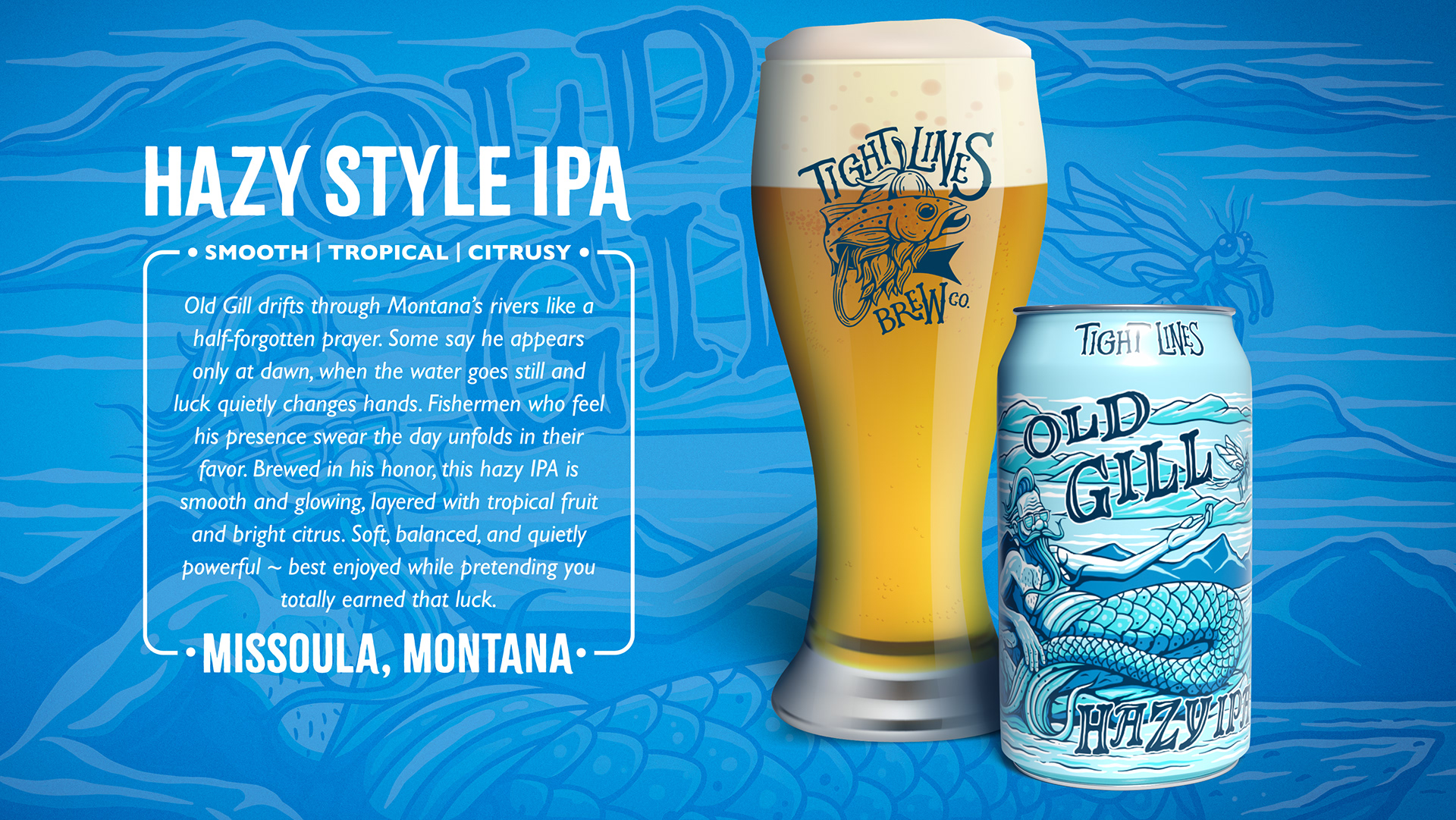 Old Gill is a Hazy IPA created for Tight Lines Brew Co., a Missoula, Montana–based brewery rooted in outdoor culture. The label features Old Gill—a mysterious half-man, half-trout who drifts through Montana’s rivers, quietly bringing good luck to anglers. The illustration blends humor and mystery while reflecting the brewery’s love of the outdoors.
